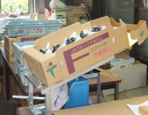 従来の煩わしい手間を解消。本体が前に傾斜し、空き箱を乗せて果実を見ながら詰められます。